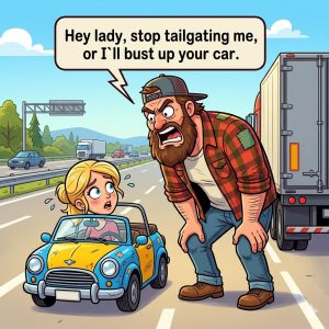 One day a truck driver was driving down a highway when he looked in his rear view mirror and saw a blonde in a little blue car…