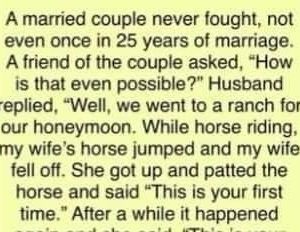 A married couple never fought, not even once in 25 years of marriage. A friend of the couple asked, “How is that even possible?” Husband replied, “Well,…