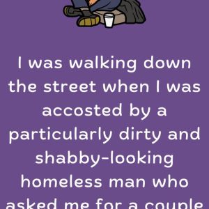 I was walking down the street when I was accosted by a particularly dirty and shabby-looking homeless man who asked me for a couple of dollars for…
