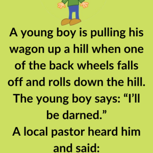 A young boy is pulling his wagon up a hill when one of the back wheels falls off and rolls down the hill. The young boy says:…
