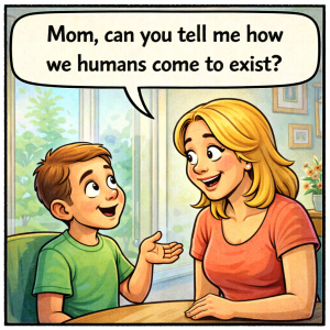 Me: “Mom, can you tell me how we humans come to exist?” Mom: “Well, that’s simple, you see, God created Adam and Eve…” Me: “Really, how come…