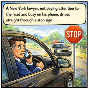 A New York lawyer, not paying attention to the road and busy on his phone, drives straight through a stop sign. An Alabama deputy sheriff sees it,…