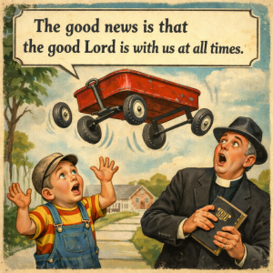 Little Gus is pulling his old, beat-up red wagon down the sidewalk. A local preacher is walking along the same path just a few feet behind him….