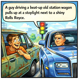 A guy driving a beat-up old station wagon pulls up at a stoplight next to a shiny Rolls-Royce. The driver of the station wagon rolls down his…