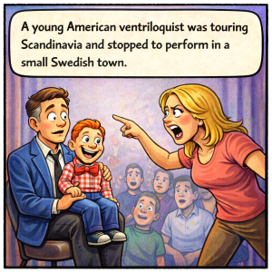 A young American ventriloquist was touring Scandinavia and stopped to perform in a small Swedish town. With his dummy on his knee, he launched into his usual…
