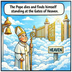 The Pope dies and finds himself standing at the Gates of Heaven. He rings the bell, and St. Peter shuffles up and opens the gate. St. Peter…