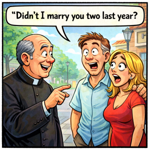 Ted and Mary were walking down the street when a priest stopped them and said,“Didn’t I marry you two last year?” Ted replied, “Yes, Father, you did.”…