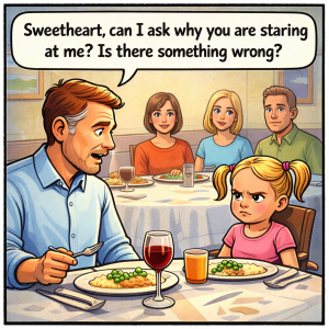 All the way through dinner, my wife’s best friend’s four-year-old daughter stared at me intently as I sat opposite her. The little girl could hardly eat her…