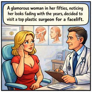A glamorous woman in her fifties, noticing her looks fading with the years, decided to visit a top plastic surgeon for a facelift. After the consultation, the…