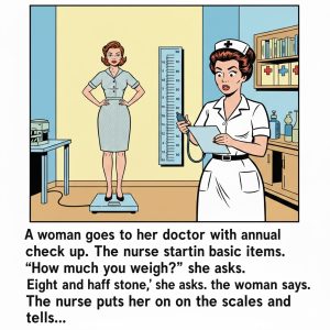 A woman goes to her doctor for her annual check up. The nurse starts with certain basic items. ‘How much do you weigh?’ she asks ‘Eight and…