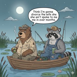 Earl and Bubba are quietly sitting in a boat fishing, chewing tobacco, and drinking beer when suddenly Bubba says, “Think I’m gonna divorce the wife she ain’t…