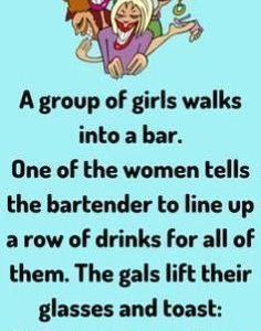 A group of girls walks into a bar. One of the women tells the bartender to line up a row of drinks for all of them. The…