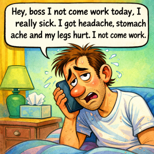 Jim calls in to work and says, “Hey, boss I not come work today, I really sick. I got headache, stomach ache and my legs hurt. I…