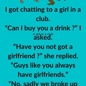 I got chatting to a girl in a club. “Can I buy you a drink ?” I asked. “Have you not got a girlfriend ?” she replied,…