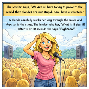 The leader says, “We are all here today to prove to the world that blondes are not stupid. Can I have a volunteer?” A blonde carefully works…