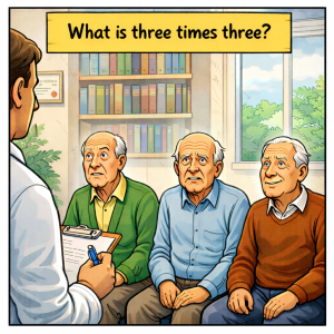 Three elderly gentlemen visit a doctor for a memory test. When asked, “What is three times three?” the first man answers “274,” and the second replies “Tuesday,”…