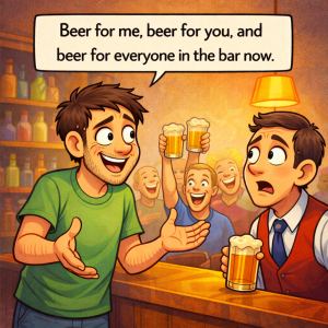 A man walks into a bar and says to the bartender, “Beer for me, beer for you, and beer for everyone in the bar now.” After drinking,…