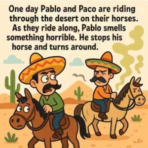 One day Pablo and Paco are riding through the desert on their horses. As they ride along, Pablo smells something horrible. He stops his horse and turns…