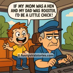 A little boy hops on a bus and sits right behind the driver. Grinning, he starts chattering: “If my mom was a hen and my dad was…