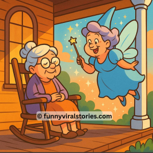 An elderly woman sat peacefully on her front porch, rocking gently in her chair and enjoying the evening breeze. Suddenly, in a twinkle of sparkling light, a…
