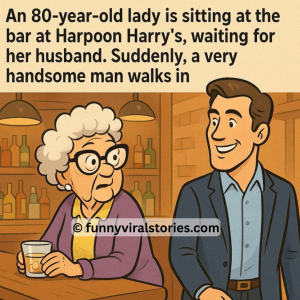 An 80-year-old lady is sitting at the bar at Harpoon Harry’s, waiting for her husband. Suddenly, a very handsome man walks in and takes a seat a…