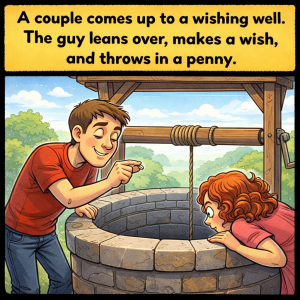 A couple comes up to a wishing well. The guy leans over, makes a wish, and throws in a penny. His wife decides to make a wish,…