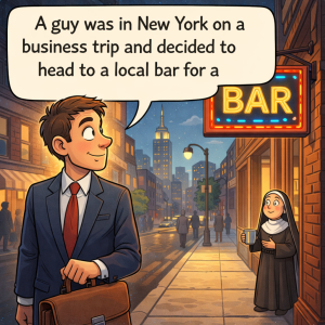 A guy was in New York on a business trip and decided to head to a local bar for a drink. Standing outside the bar was a…