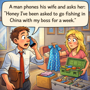 A man phones his wife and asks her: “Honey I’ve been asked to go fishing in China with my boss for a week. This is a good…