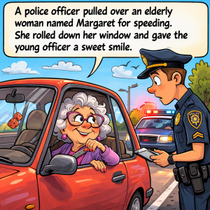 A police officer pulled over an elderly woman named Margaret for speeding. She rolled down her window and gave the young officer a sweet smile. “Ma’am, do…