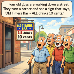 Four old guys are walking down a street. They turn a corner and see a sign that says, “Old Timers Bar – ALL drinks 10 cents.” They…