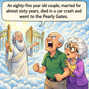 An eighty-five year old couple, married for almost sixty years, died in a car crash and went to the Pearly Gates. They had been in good health…