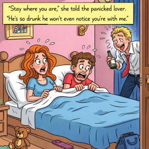 A wife was with her lover when she heard her husband’s key in the door. “Stay where you are,” she told the panicked lover. “He’s so drunk…