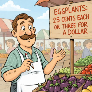 Eggplants for sale A grocer put up a sign that read: “Eggplants: 25 cents each or three for a dollar.” All day long, customers came in exclaiming:…
