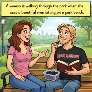 A woman is walking through the park when she sees a beautiful man sitting on a park bench. He’s reading a book and eating some fruit out…