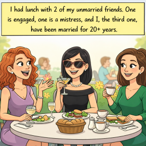 I had lunch with 2 of my unmarried friends. One is engaged, one is a mistress, and I, the third one, have been married for 20+ years….