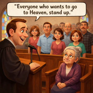 The preacher said, “Everyone who wants to go to Heaven, stand up.” Everyone stood except one older lady. The preacher asked, “Don’t you want to go to…