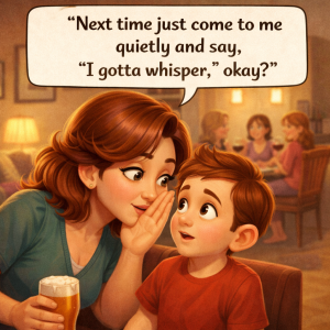 Little Johnny wakes up desperate to use the bathroom. He can hear his mom downstairs chatting with friends, so he runs down and blurts out: “Mommy! I…
