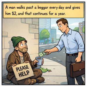 A man walks past a beggar every day and gives him $2, and that continues for a year.Then suddenly the daily donation changes to $1.50. “Well,” he…