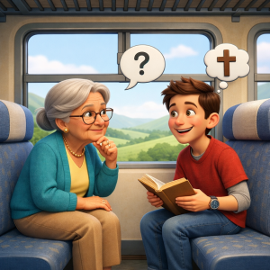 A young man and an old woman are traveling by train. And after looking closely at the young man, the old woman leans forward and says, “Excuse…