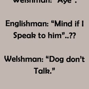 Englishman: “That your Dog”..?? Welshman: “Aye”. Englishman: “Mind if I Speak to him”..?? Welshman: “Dog don’t Talk.” Englishman: Hey Dog, how’s it going”..?? Dog: “Doing All Right,…