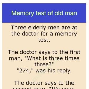 Three elderly men are at the doctor for a memory test. The doctor says to the first man, “What is three times three?” “274″ was his reply….