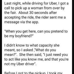Last night, while driving for Uber, I got a call to pick up a woman from over by the fair. About 30 seconds after accepting the ride,…