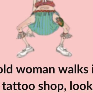 An old woman walks into a tattoo shop, looks directly at the artist and says “I want to get a tattoo”. The artist hesitantly replies “Well, ok…