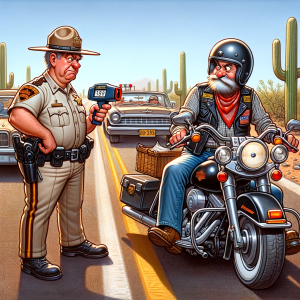 An Arizona Highway Patrol officer stops a Harley