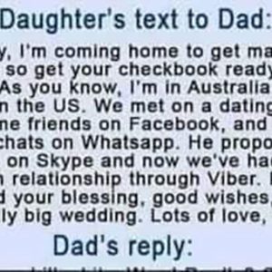 Daughter’s text to Dad: Daddy, I’m coming home to get married soon, so get your checkbook ready. LOL! As you know, I’m in Australia and he’s in…