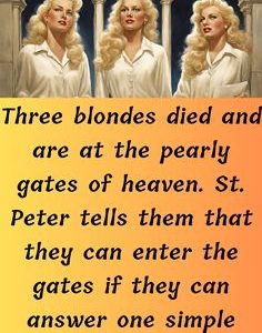 Three blondes died and are at the pearly gates of heaven. St. Peter tells them that they can enter the gates if they can answer one simple…