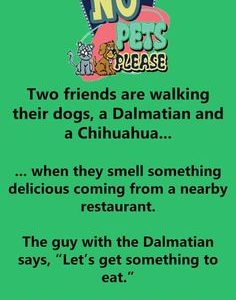 … when they smell something delicious coming from a nearby restaurant. The guy with the Dalmatian says, “Let’s get something to eat.” But the guy with the…