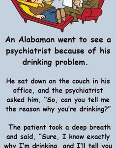 An Alabaman went to see a psychiatrist because of his drinking problem. He sat down on the couch in his office, and the psychiatrist asked him, “So,…