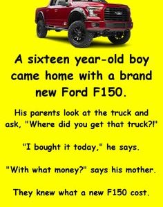 A sixteen year-old boy came home with a brand new Ford F150. His parents look at the truck and ask, “Where did you get that truck?!” “I…