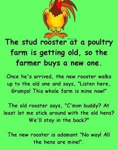 Once he’s arrived, the new rooster walks up to the old one and says, “Listen here, Gramps! This whole farm is mine now!” The old rooster says,…